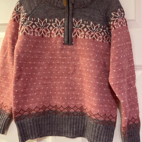 Jotunheim ullgenser for jente i størrelse 134. Genseren er i grå merinoull med mønster og høy hals med glidelås. Passer som varm og myk hverdagsgenser eller som mellomlag på kjølige dager.