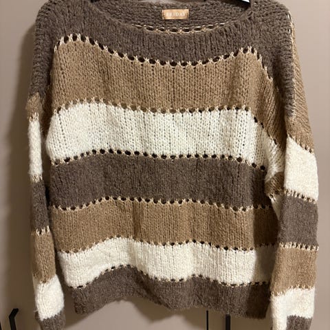 Dette er en oversize genser fra Pepper,som er laget av viskose og ull.Veldig myk og god. Den henger veldig fint motiv med blomster i grått og gull. Passer størrelse fra M-XL.