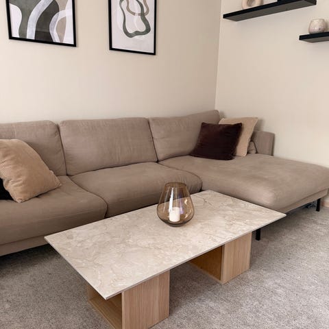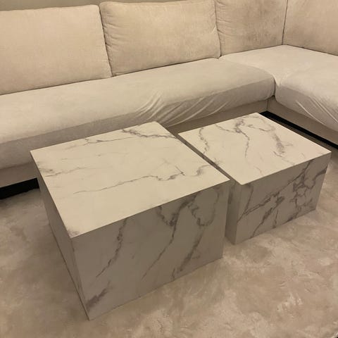 De har en moderne, grå stein-/betonglook og passer fint sammen som sett, men kan også brukes hver for seg. Perfekte som sofabord eller TV-bord.