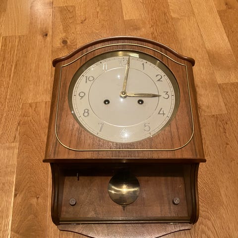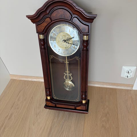 Pen veggklokke med enkle detaljer selges rimelig. Opptrekker følger med, klokka går riktig og slår hver halv time. Må hentes sentralt i Skien.