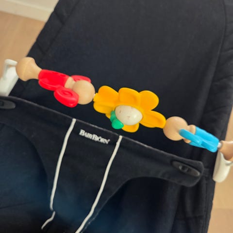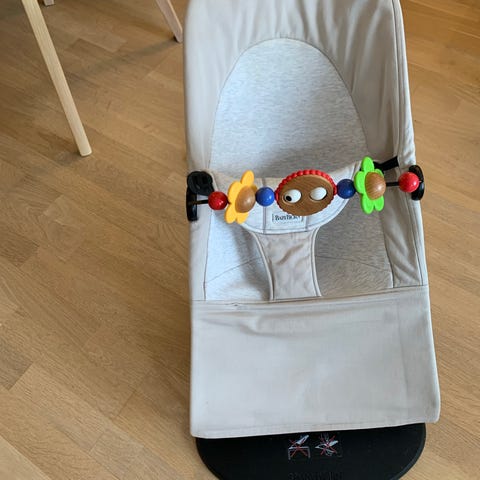 Selger en BabyBjörn vippestol i grå farge. Stolen er pent brukt og i god stand, uten skader. Trekket er helt og rent. Lekebøyle følger med.