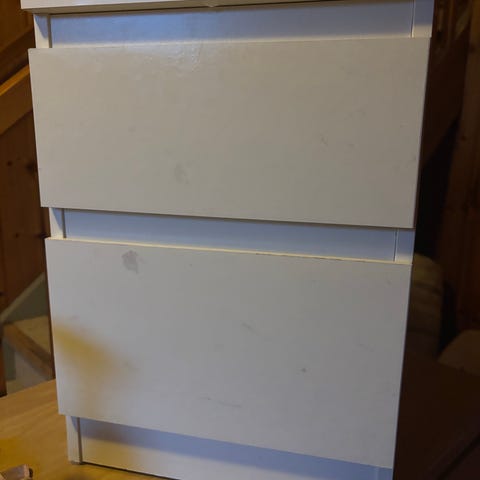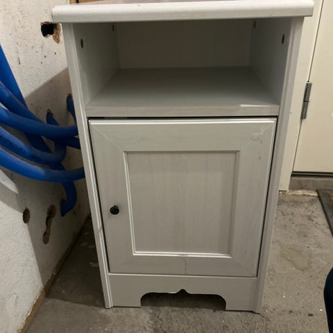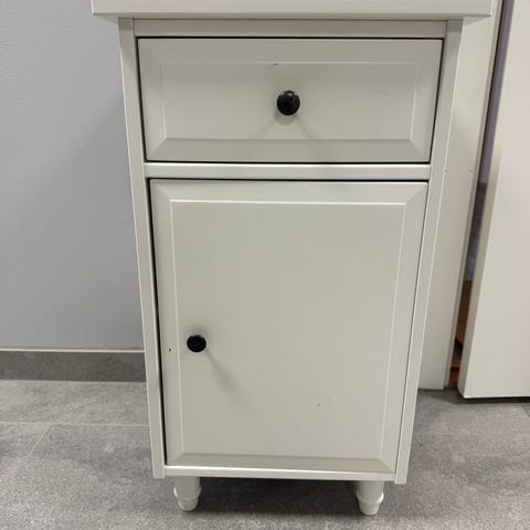 IKEA nattbord i hvit utførelse. Møbelet har en åpen hylle øverst og et skap med dør nederst, som gir oppbevaringsplass ved siden av sengen. Passer som nattbord på soverom, og kan også brukes som lite sidebord i andre rom der det er behov for ekstra oppbevaring.