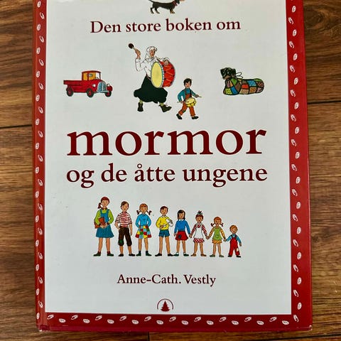 De fleste kjenner mormor og de åtte ungene fra Barnetimen, TV eller kino. Anne-Cath. Vestly skrev den første av disse varme og kloke bøkene om den romslige familien med åtte unger, en hund og en mormor, for 50 år siden. Her er de fem første bøkene samlet i én fargerik bok. Fordi de bor litt trangt og er mange, er nok Maren, Martin, Marte, Mads, Mona, Milly, Mina og Morten litt mer oppfinnsomme enn unger flest. Noe som kan føre til mange morsomme situasjoner ... som når Morten minstemann inviterer fire griser på kaffebesøk i finstuen på nabogården. Litt skummelt kan det også bli, når Mina og Milly møter en bjørn i skogen, men da er det så fint at man har en far med bart og seks søsken som kan hjelp til. Og en mormor da, som har en ku på rommet sitt. Bøkene om familien som flytter fra en knøttliten byleilighet til et lite rødt hus i skogen tar oss tilbake til et Norge da det var et eventyr å få innlagt telefon, og hvor man kunne stue åtte barn og en mormor sammen på et lasteplan og kjøre av gårde til fjells.