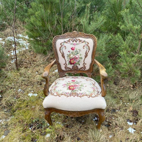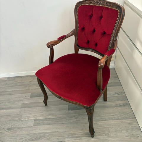 Selger en nydelig vintage lenestol i rosatonet møbelstoff med vakre utskjæringer i mørkt treverk. Stolen har elegant buet rygg, dekorative detaljer i front og flotte, svungne ben.