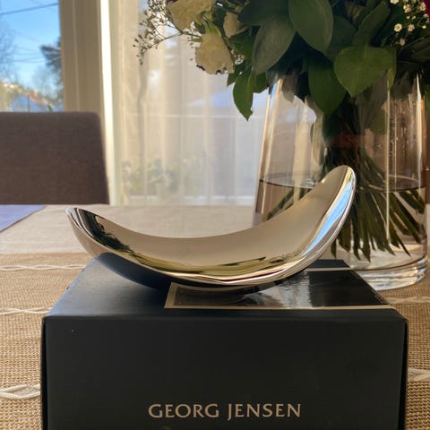 Georg Jensen dekorasjonsboller og lysestaker i blankt stål.