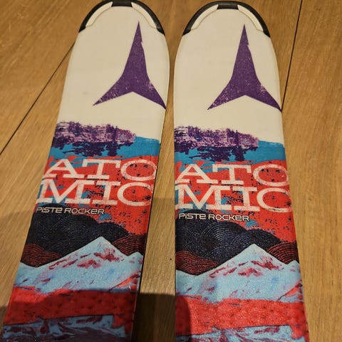 Skiene har integrerte alpinbindinger med justerbar hæl- og tådel.