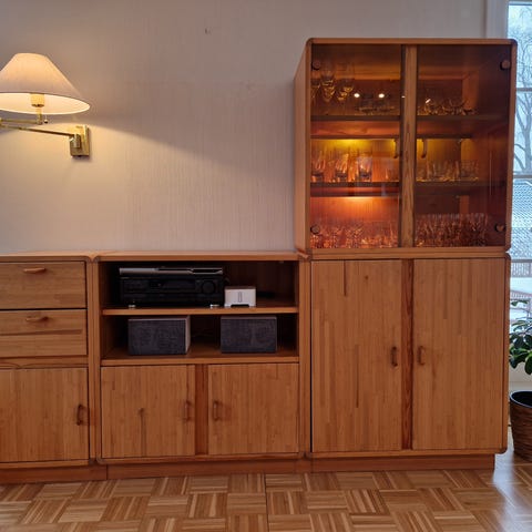 Veggseksjon i to deler. Eikefarget. Mål høyskap 187x90x45 HxBxD. Mål sideskap 117x136x45 HxVxD. Selges uten innhold.