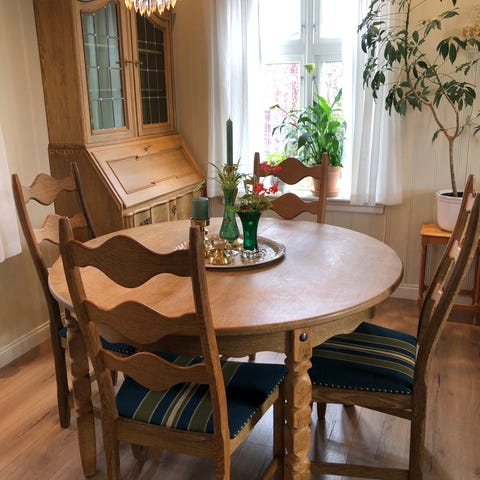 God original stand med jevn og naturlig patina. Noe normal bruksslitasje som forventes for alder. Stolene har originalt trekk.