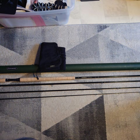 Veldig pen stang. Uorginalt sage trekk og tube som passer perfekt til 13 foter. Se bilder. Det er to rør i tuben. Jeg har korkdelen i det ene røret og de 3 andre delene i trekket i den andre tuben.