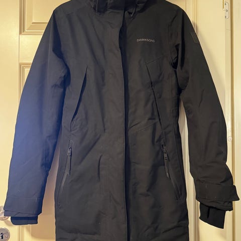 Didriksons Mea tykk, parkas for dame i størrelse 42. Jakken er grønn og laget i polyester med Didriksons STORMsystem, som er utviklet for å være vanntett. Lengre modell med hette og avtagbar eller justerbar fuskepelskant. Lukkes med glidelås og trykknapper i front, og har skråstilte glidelåslommer. Egnet som regntøy og ytterjakke i vått og kjølig vær.