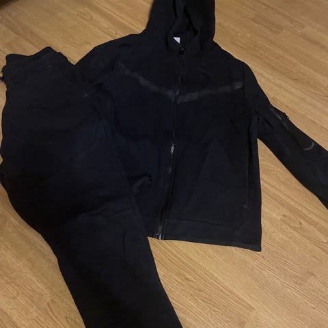 Nike tech joggedress i svart str XL 156-166 cm. Sett med hettejakke med glidelås og matchende bukse. Materiale i bomull. Jakken har hette og Stikklommer i siden, glidelåslomme på ene armen. Buksen har elastisk linning og snorstramming i livet. Stikkklommer i sidene og glidelåslomme på ene låret. Egnet som hverdags- og fritidsklær for barn i høyde rundt 156–166 cm. Bukse har nor synlig bruk i form av noe slitasje på knær og bak. Noe små-nupoer bak og ett bittelite hull (se siste bildet). Ellers hel og pen. Jakken er fremdeles pen. Tøffe detaljer og god kvalitet i stoffet. Mye bruk igjen.