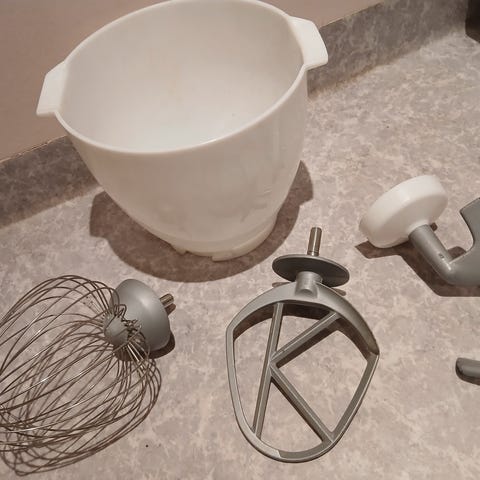 Tilbehør: 4 kroker/spader (ovennevnte bruk), bolle 6,7 l m deksel i maskin/ Kjøttkvern m/deler,