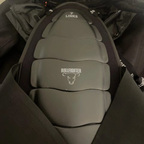 Ryggskinnen er svart og gul med justerbare stropper og bred midjestropp med spenne. Settet er egnet til bruk på motorsykkel og annen motorsport hvor det er behov for beskyttende kjøreutstyr.brukt 1 time tilsammen.som nytt