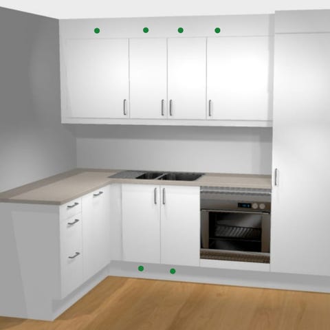Det er hakk i fronten under stekeovnen, og døren til venstre (se bilder). Det er også noen lysebrune flekker på benkeplaten (se bilder)