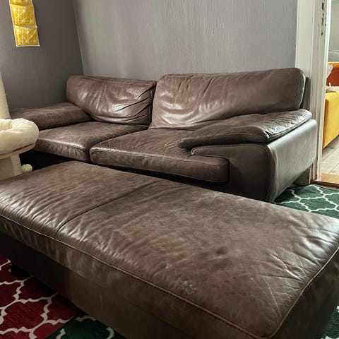 Furninova skinnsofa i mørkebrunt semianilin skinn av god kvalitet. Brukt daglig i noen år, men de siste årene har den stått i en kjellerstue og nesten ikke blitt brukt. Mye bruk igjen. Noen synlige skrammer/merker i skinnet.