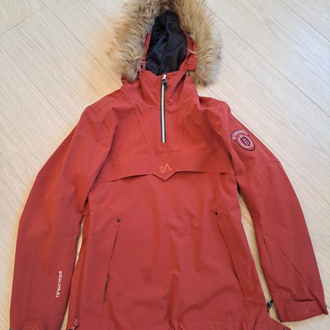 Twentyfour anorakk for dame i størrelse 38. Jakken er brun og laget hovedsakelig av polyester. Den har halv glidelås i front, hette med avtakbar fuskepels og for i kontrastfarge. Ytterjakken har sidelommer med glidelås og lengre bakstykke for ekstra dekning. Passer som allsidig yttertøy til hverdagsbruk og tur.