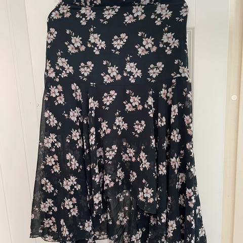 Part Two skjørt i svart viskose for dame i størrelse M. Skjørtet har hvitt småmønstret trykk og et lett, fallende stoff. Lengden er midi og fasongen er vid med flere paneler som gir bevegelse i stoffet. Passer til hverdagsbruk eller mer pyntede anledninger, og kan kombineres med både enkle topper og strikkegenser.