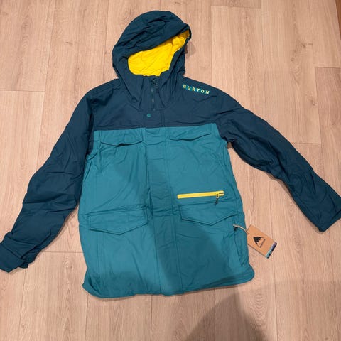 Quiksilver jakke i størrelse 16/XL. Jakken er tofarget i grønn og mørk blå. Ytterstoff, fôr og isolasjon er i 100 % polyester. Modellen har hette og flere lommer, blant annet brystlomme med glidelås.