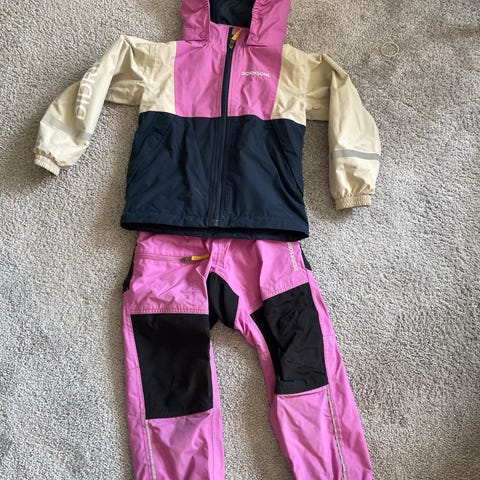 Stormberg bukse for barn , størrelse 110. Sett bestående av bukse og langermet genser (genser i ull/viskose følger med gratis). Buksen har lilla felt med svarte forsterkningsfelt og strikk nederst i beina. Genseren er langermet og lilla. Materiale i polyester. Passer til jente i størrelse 110, egnet til hverdagsbruk og utelek.