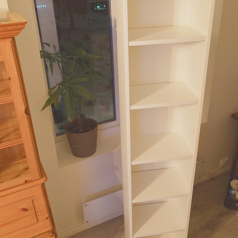 Skap med hyller og en skyvedør. Skaper har hjul og det er lett å flytte på.