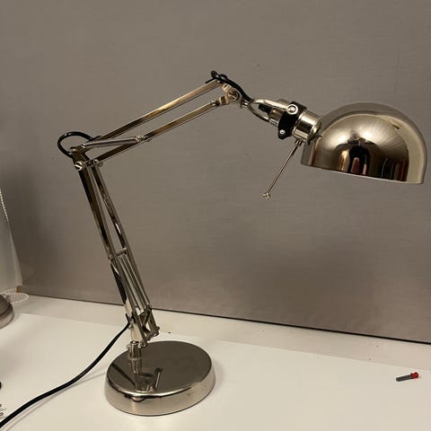 Praktisk regulerbar bordlampe. Justerbart hode. Måler oppreist ca. 60cm høy og diameter fot 15cm. Max 40 watt E14. Hentes på Torshov. Heis. Buss 20 og 30 stopper rett utenfor.