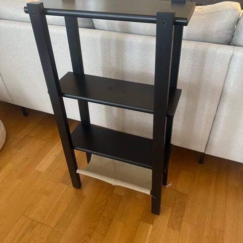 Liten hylle i tre med skuff i rotting som kan henges på veggen