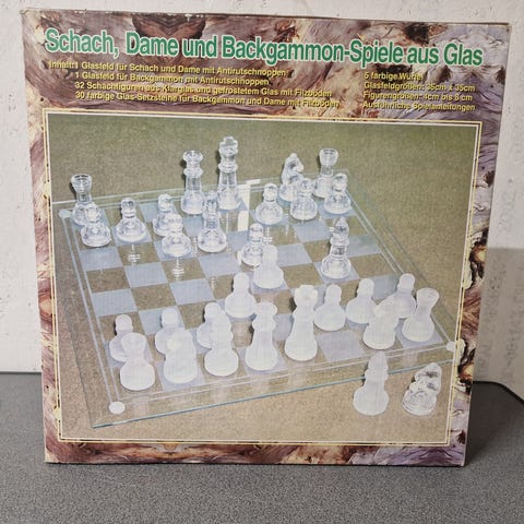 Glass Game Set 3-i-1 brettspill i glass. Sett med glassbrett og brikker til sjakk, dam og backgammon. Inneholder gjennomsiktige og frostede glassbrikker samt terninger. Leveres i original eske med formstøpt innmat for oppbevaring av brett og brikker.dette har aldri vært i bruk men har stått i skapet lenge. Gi bud!