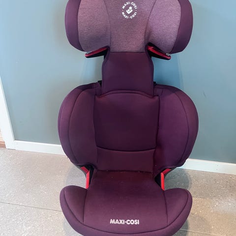Maxi-Cosi barnesete. Det har høg rygg med sidestøtte og justerbar hovudstøtte. Barnesetet vert festa med bilen sit setebelte og har i tillegg ISOFIX-fester for ekstra stabilitet.