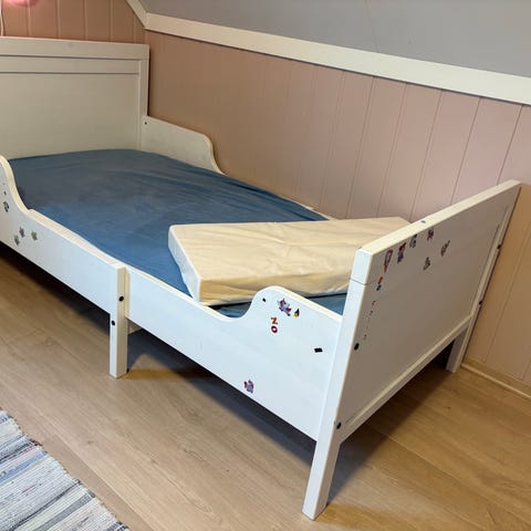 Sengen selges med Ikea barnemadrass i god stand(ingen flekker), avtakbar sengehest og en stor skuff under sengen som rommer hele arealet til sengen og er meget praktisk! Sengen har noen få «merker» i enden av sengen som vist på bilde, og et merke der sengehesten har gnisset inntil sengen (den kan skrus fast, men vi gjorde ikke det, derfor litt merke etter «gnissing». Solid og søt juniorseng til jente, men kan også lett males i ny farge.