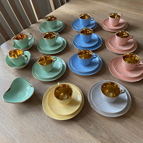 Porselen kaffeservice i pastellfarger med gullkant. Serviset består av moccakanne med lokk, melkemugge, tre trekantede skåler i ulike størrelser, kopper med tilhørende asjetter i ulike pastellfarger samt teskjeer. Innvendig har koppene gull overflate.