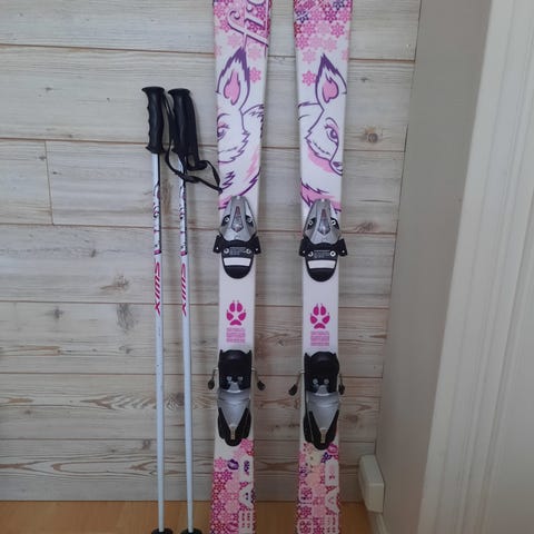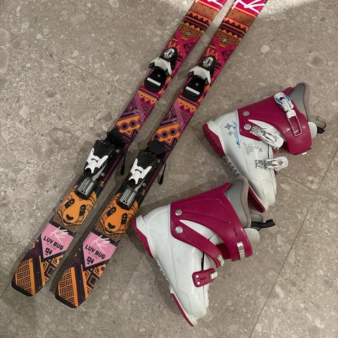 K2 Luv Bug alpinski i rosa/hvite farger med blomsterdekor og alpinstøvle-bindinger. Passer som carvingski til preparerte bakker. Undersiden har tradisjonell svart såle tilpasset vanlig alpint bruk. Egnet for barn/unge som trenger et lettkjørt alpinski-sett med integrerte bindinger.