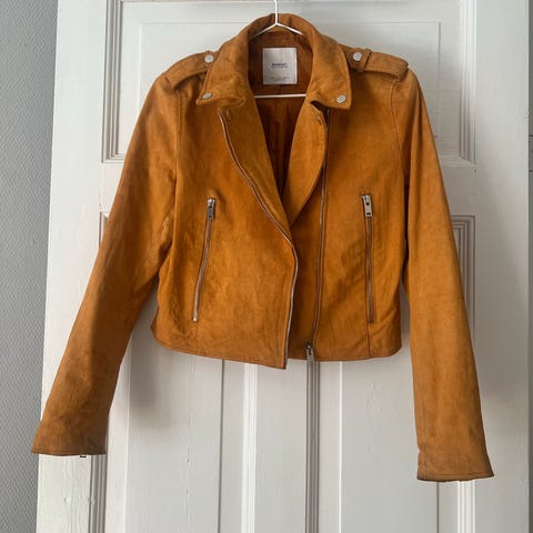 Acne Studios semsket skinnjakke for dame i størrelse 40. Jakken er i beige/lys rosa semsket skinn med klassisk krage og asymmetrisk glidelås foran i rosegull. Den har glidelåslommer i front og glidelås nederst på ermene. Kort, rett modell som passer godt til hverdagsbruk og kan kombineres med både bukser og skjørt. Materiale: semsket skinn.
