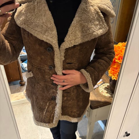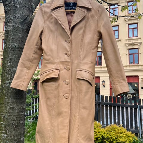 Skinnjakke i kamel farge med fuskepels krage og ermer. Vattert lett så man holder seg varm