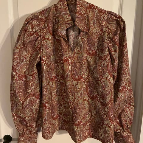 Bunadskjorte eller festbluse med mønster fra Fæbrik, sydd av meg i nydelig bomullsstoff med paisley print fra Rainbow fashion. Denne skjorta er sydd i størrelse Small, men passer også meg som er L. Den er litt one size/ stor i størrelsen, med vide armer og puff. Nydelig alternativ til bunaden, men også like fin til penbuksa eller dongeribuksa.