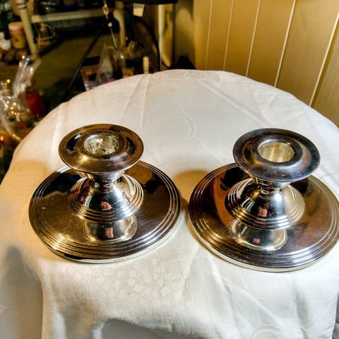 Diverse sølv lysestaker i 830s selges helst samlet for 25000,-. Noen av dem ser helt nytt ut og noen er godt brukt med noe skader. Totalt vekt er 3993g.