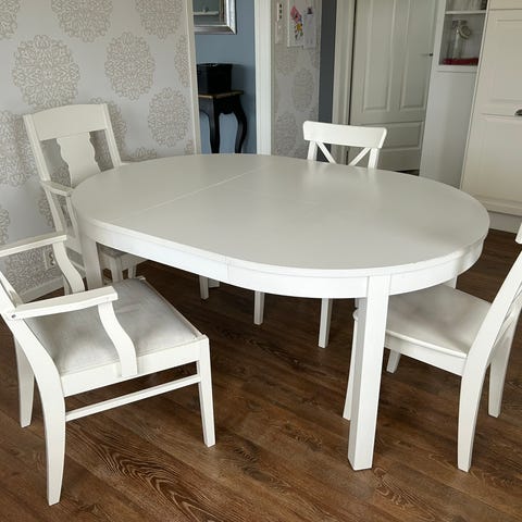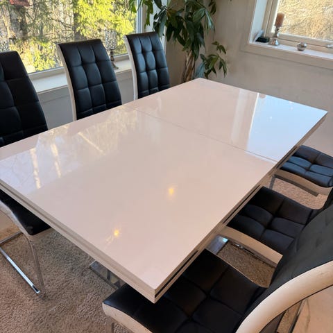Spisebord med 6 hvite stoler