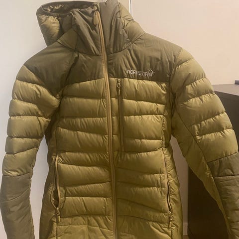 Norrøna dunjakke for dame i størrelse XS. Jakken er rød og fylt med dun. Modellen har hette og gjennomgående glidelås i front. Yttermaterialet er lett og vattert med horisontale sømmer. Egnet som ytterjakke til hverdagsbruk og ulike utendørsaktiviteter i kjøligere vær. Har kommet meget godt ut i tester. Nypris, kr 5-6000,-