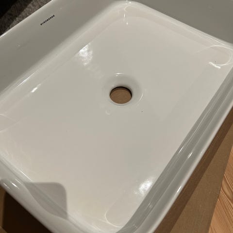 Svedbergs Saxe servantskap med servant i bredde ca. 50 cm. Servantskapet har mørk brun front med horisontal struktur og integrert metallhåndtak. Servanten er hvit og rektangulær med avsatt kranhull og overløp. Innvendig har skapet hylle for oppbevaring. Egnet som baderomsmøbel for mindre og mellomstore