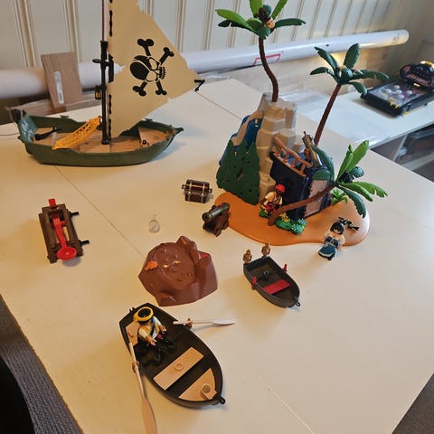 Playmobil sjørøverskip med flere sjørøverfigurer og variert tilbehør. Settet inkluderer et stort sjørøverskip med to master og seilrigg, samt flere Playmobil-figurer kledd som sjørøvere. I tillegg følger det med kanoner, våpen, tønner, kiste, kikkert og annet småtilbehør som passer til sjørøverlek. Skipet og figurene er laget i plast og er egnet som lekesett for barn som liker sjørøvertema.