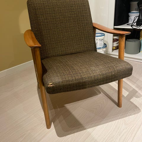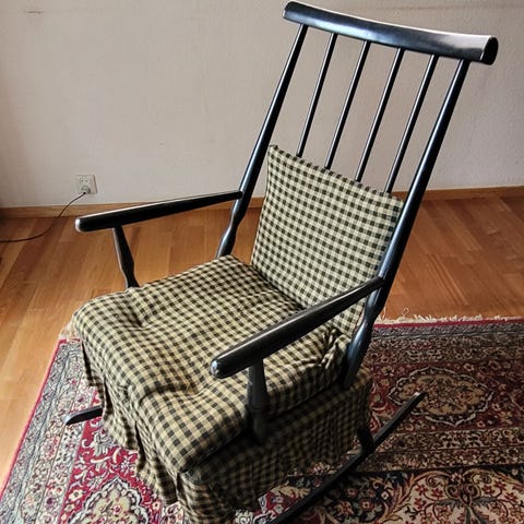 Gyngestol. Kjøpt brukt og pusset opp for 8 år siden (pusset, malt i matt svart og sydd nye trekk). I god stand, minus litt slitasje i malingen på enden av meiene og én manglende knapp i sitteputen.