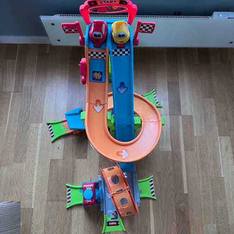 Bilbane med to biler selges da den ikke blir brukt lengre. Ca 48cm høy.