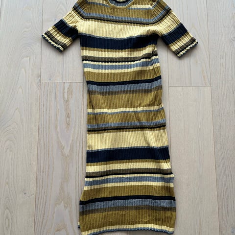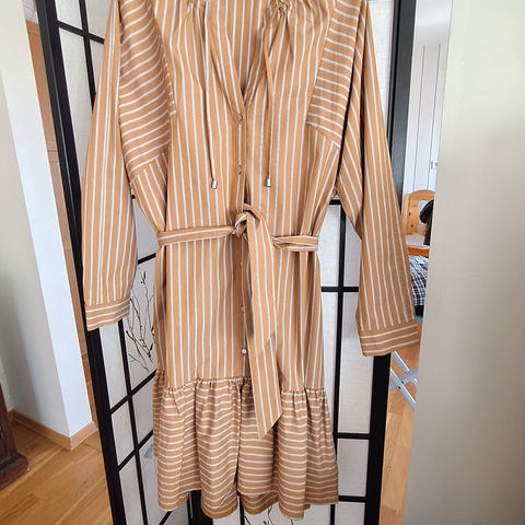 H&M hverdagskjole i lin i størrelse L. Kan også brukes som kimono.Kjolen er flerfarget med vertikale striper i lyse og brune toner. Modellen har V-utringning, lange ermer og knytebelte i livet. Lengden går omtrent til under kneet, og passformen er rett og løs. Materialet i lin gir et lett og luftig uttrykk som egner seg godt til hverdagsbruk.