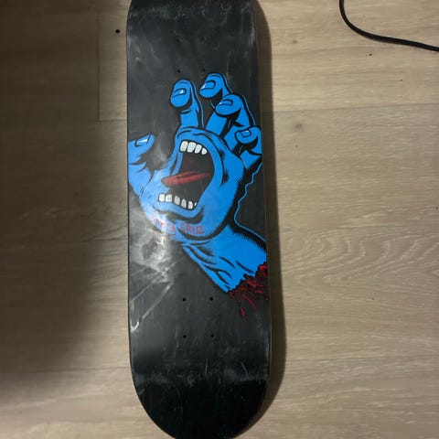 Komplett Baker skateboard med svart deck dekorert med ulike klistremerker. Undersiden har slitasje etter bruk. Brettet har standard trucks og fire hjul med mønster. Passer til bruk i skatepark eller på asfalt. Ordinær pris for ny er fra 890-990kr