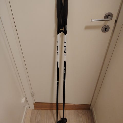 Skistaver på 130 cm i svart farge med korkhåndtak og håndstropper. Stavene har spisser med trinser egnet for bruk på snø, men mangler den ene trinsen. Ellers kun brukt et par ganger (Trinsen datt av og så ble de stående i en bod)