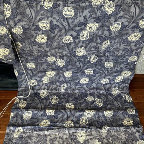 Selger 2 stk KID liftgardiner og 2 stk pynteputetrekk i mørk blå velour.
