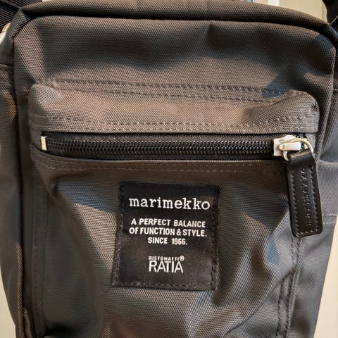 Selger Marimekko PAL skulderveske. Mørk grå. Lite og pent brukt. Det ses litt slitasje på den ene glidelåsanhenget som ses på bildet, ellers ingen bruksmerker.