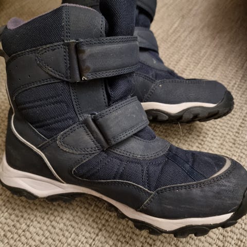 Viking Goretex vintersko for barn i størrelse 35. Brukt kun en kort sesong derfor lite brukt. Ingen synlige slitasje på sko eller såle. Skoene er unisex og har blå hovedfarge med turkise detaljer samt reflekser foran og bak. Modellen har høy skaft og lukkes med borrelåsremmer over vrist og ankel for enkel av- og påkledning. Overdelen er i tekstil og syntetisk materiale, og sålen har grovt mønster for bedre grep. Egnet som vintersko til hverdagsbruk for barn. Hentes, Vippses. Evt sendes med Fiks ferdig☺️