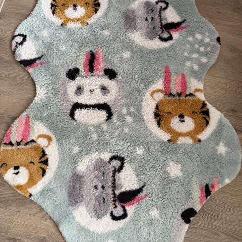 IKEA rundt barnerug med krokodillemotiv i blå bunnfarge og gult motiv. Teppet har et lekent dyremotiv med krokodille og passer til barnerom eller lekeområde. Rund fasong gjør det egnet midt på gulvet som leke- eller sitteplass. 60cm