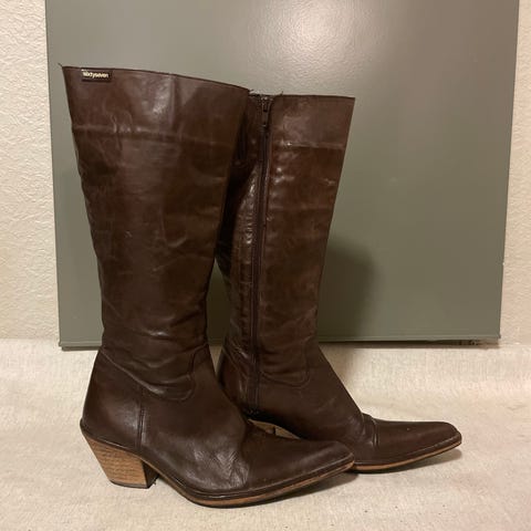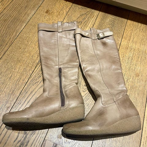 Bianco støvler i størrelse 35. Høye, brune skinnstøvler med glidelås på siden og hæl. Spiss tå. Passer til bruk i hverdagen eller til mer pyntede antrekk.
