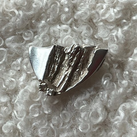 Anheng i sølv 925S. Formen er organisk med strukturert overflate og små kuler på den ene siden, og en glatt bakside stemplet med 925S. Smykket er 2 cm bredt og 1,5 cm høyt og vekt er 2.3 gram.
